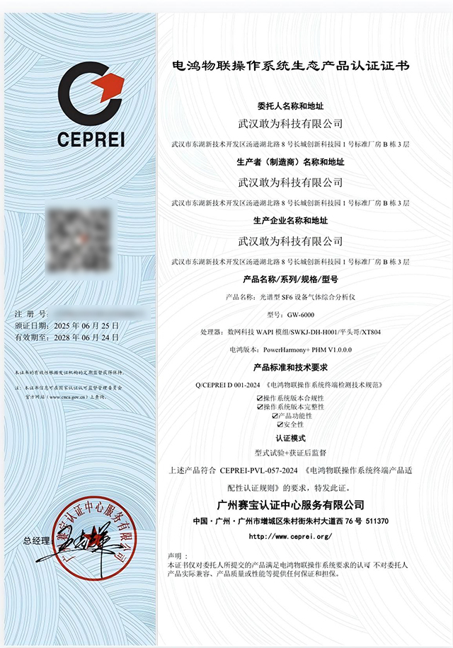 此外,GW-6000型光譜型SF6設(shè)備氣體綜合分析儀在兼容性、安全性和可靠性上完全滿足電力行業(yè)最高標(biāo)準(zhǔn),獲電鴻物聯(lián)操作系統(tǒng)生態(tài)產(chǎn)品認(rèn)證,無縫融入數(shù)字電網(wǎng)生態(tài),為電網(wǎng)智能化運(yùn)維提供精準(zhǔn)數(shù)據(jù)支撐。