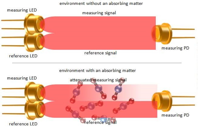 傳感器由光源、鍍金氣室、窗片、紅外探測器等光學組件構成,光源發(fā)出的紅外光窗片進入氣室,光分別穿透氣體后由紅外探測器接收。通過對信號進行分析,可以得出氣體中相關組分的濃度。