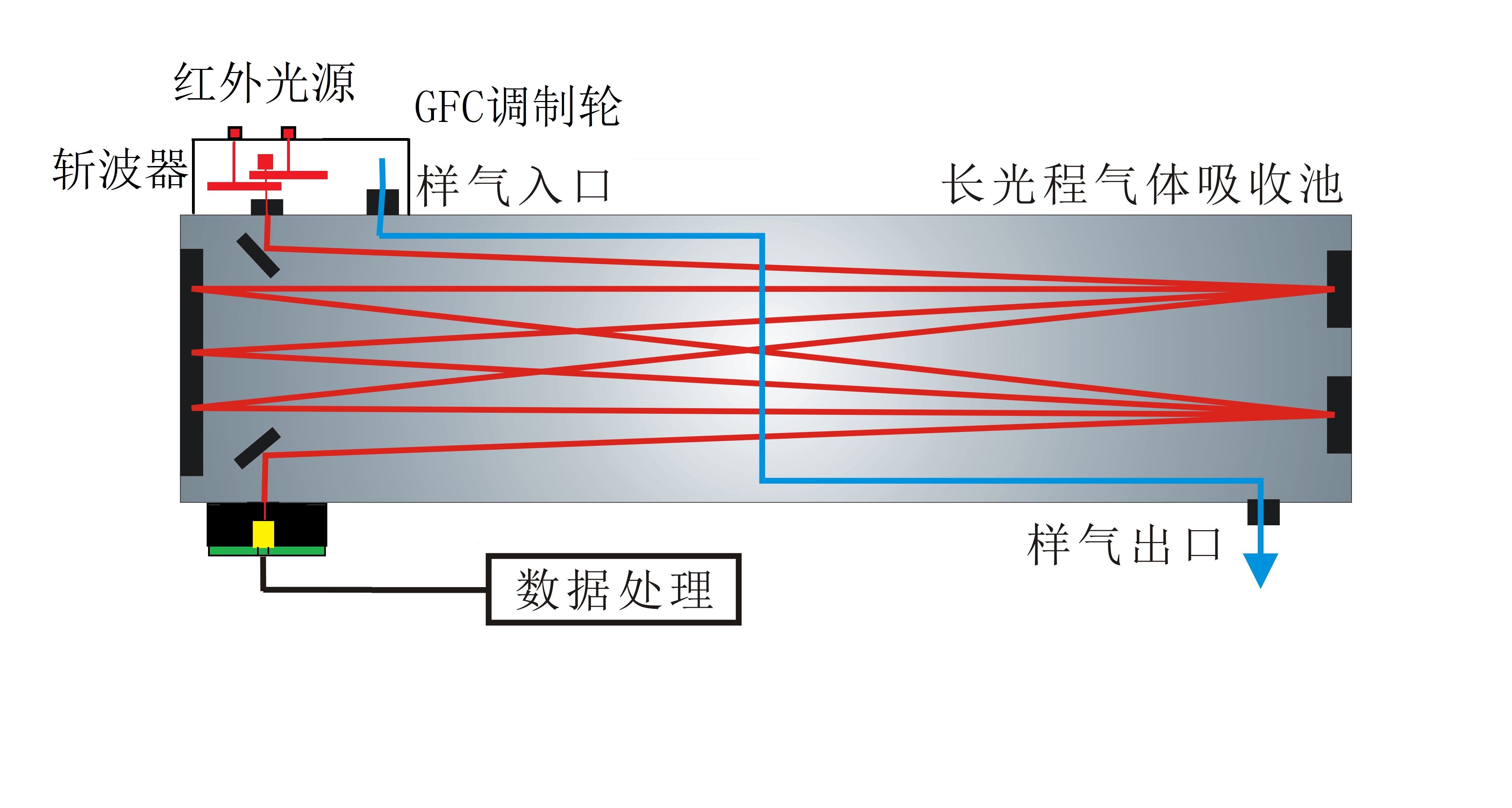 光源發(fā)出的紅外光經(jīng)GFC調(diào)制輪交替進(jìn)入氣體室,一路被充滿CO的氣室所吸收,一路穿過完全不含CO的氣室,兩路光分別經(jīng)透鏡匯聚后由探測器接收,經(jīng)過處理得到吸收信號和參考信號。