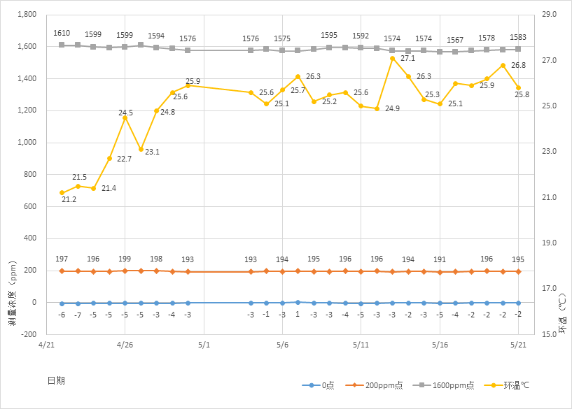 經(jīng)過30天24h漂移的跟蹤測量,對傳感器長期測量的穩(wěn)定性進(jìn)行考察,得到了CO傳感器在零點(diǎn)、80%量程濃度的長期穩(wěn)定性數(shù)據(jù)。傳感器氣室恒溫40℃在室溫環(huán)境下進(jìn)行測量